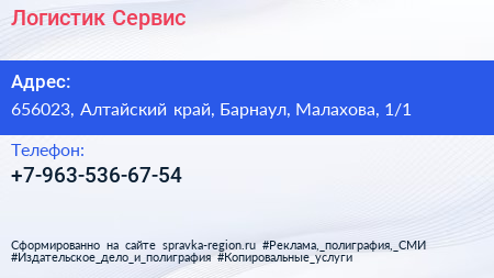 Логистик-Сервис по адресу 656023, Алтайский край, Барнаул, Малахова, 1/1 в дальнейшем Организация, размещена в следующих категориях: