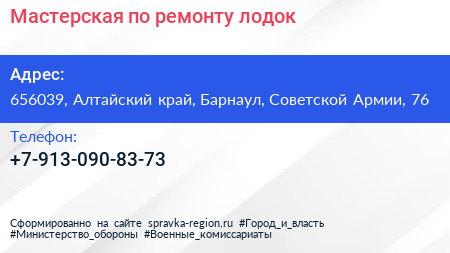 Мастерская по ремонту лодок по адресу 656039, Алтайский край, Барнаул, Советской Армии, 76 в дальнейшем Организация, размещена в следующих категориях: