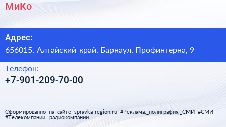 МиКо по адресу 656015, Алтайский край, Барнаул, Профинтерна, 9 в дальнейшем Организация, размещена в следующих категориях: