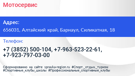 Мотосервис по адресу 656031, Алтайский край, Барнаул, Силикатная, 18 в дальнейшем Организация, размещена в следующих категориях: