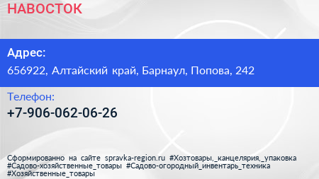 НАВОСТОК по адресу 656922, Алтайский край, Барнаул, Попова, 242 в дальнейшем Организация, размещена в следующих категориях: