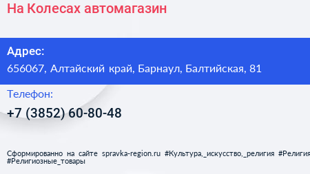 На Колесах, автомагазин по адресу 656067, Алтайский край, Барнаул, Балтийская, 81 в дальнейшем Организация, размещена в следующих категориях: