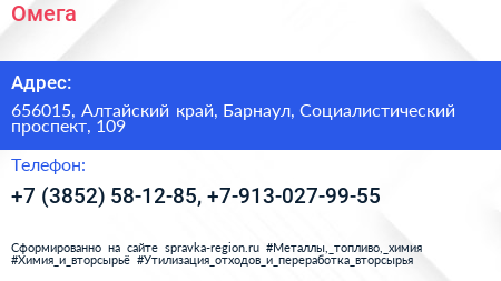 Омега по адресу 656015, Алтайский край, Барнаул, Социалистический проспект, 109 в дальнейшем Организация, размещена в следующих категориях: