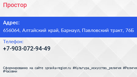 Простор по адресу 656064, Алтайский край, Барнаул, Павловский тракт, 76Б в дальнейшем Организация, размещена в следующих категориях: