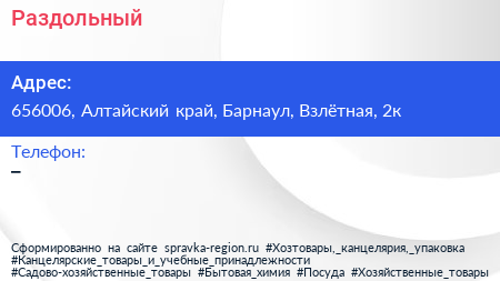 Раздольный по адресу 656006, Алтайский край, Барнаул, Взлётная, 2к в дальнейшем Организация, размещена в следующих категориях: