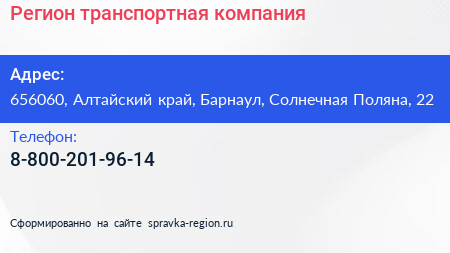Регион, транспортная компания по адресу 656060, Алтайский край, Барнаул, Солнечная Поляна, 22 в дальнейшем Организация, размещена в следующих категориях: