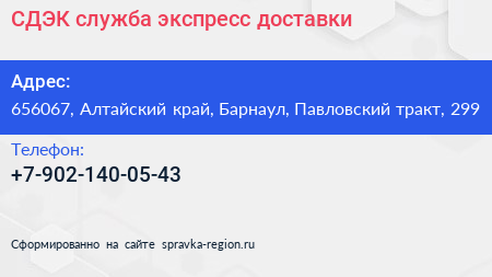 СДЭК, служба экспресс-доставки по адресу 656067, Алтайский край, Барнаул, Павловский тракт, 299 в дальнейшем Организация, размещена в следующих категориях: