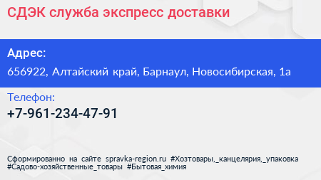 СДЭК, служба экспресс-доставки по адресу 656922, Алтайский край, Барнаул, Новосибирская, 1а в дальнейшем Организация, размещена в следующих категориях:
