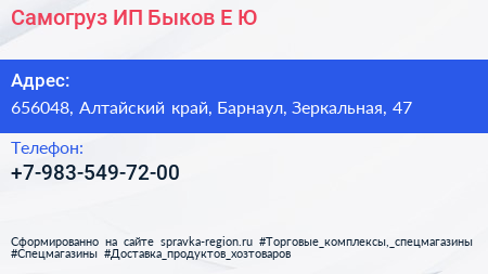 Самогруз, ИП Быков Е.Ю. по адресу 656048, Алтайский край, Барнаул, Зеркальная, 47 в дальнейшем Организация, размещена в следующих категориях: