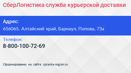СберЛогистика, служба курьерской доставки по адресу 656065, Алтайский край, Барнаул, Попова, 73а в дальнейшем Организация, размещена в следующих категориях: