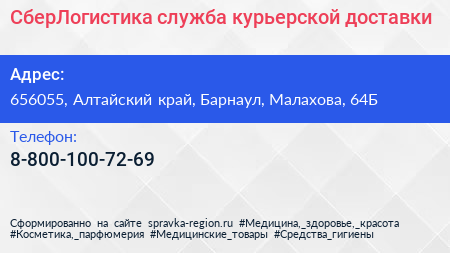 СберЛогистика, служба курьерской доставки по адресу 656055, Алтайский край, Барнаул, Малахова, 64Б в дальнейшем Организация, размещена в следующих категориях: