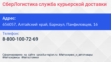 СберЛогистика, служба курьерской доставки по адресу 656057, Алтайский край, Барнаул, Панфиловцев, 16 в дальнейшем Организация, размещена в следующих категориях:
