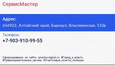 СервисМастер по адресу 656922, Алтайский край, Барнаул, Власихинская, 133в в дальнейшем Организация, размещена в следующих категориях: