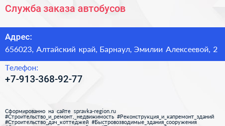 Служба заказа автобусов по адресу 656023, Алтайский край, Барнаул, Эмилии Алексеевой, 2 в дальнейшем Организация, размещена в следующих категориях: