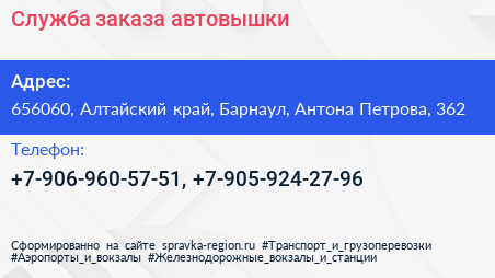 Служба заказа автовышки по адресу 656060, Алтайский край, Барнаул, Антона Петрова, 362 в дальнейшем Организация, размещена в следующих категориях: