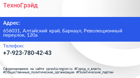 ТехноГрэйд по адресу 656031, Алтайский край, Барнаул, Революционный переулок, 120а в дальнейшем Организация, размещена в следующих категориях: