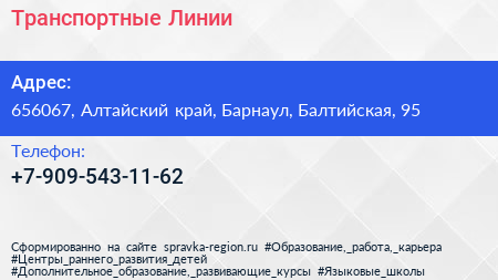 Транспортные Линии по адресу 656067, Алтайский край, Барнаул, Балтийская, 95 в дальнейшем Организация, размещена в следующих категориях: