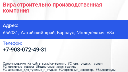 Вира, строительно-производственная компания по адресу 656031, Алтайский край, Барнаул, Молодёжная, 68а в дальнейшем Организация, размещена в следующих категориях: