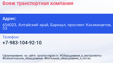 Вояж, транспортная компания по адресу 656023, Алтайский край, Барнаул, проспект Космонавтов, 53 в дальнейшем Организация, размещена в следующих категориях: