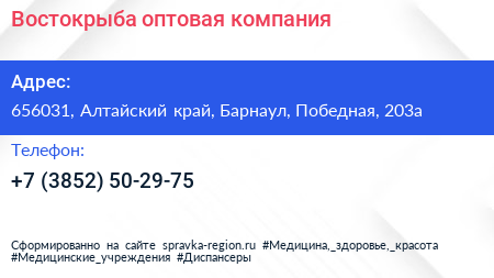 Востокрыба, оптовая компания по адресу 656031, Алтайский край, Барнаул, Победная, 203а в дальнейшем Организация, размещена в следующих категориях: