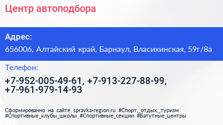 Центр автоподбора по адресу 656006, Алтайский край, Барнаул, Власихинская, 59г/8а в дальнейшем Организация, размещена в следующих категориях:
