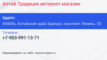 Алтай Традиция, интернет-магазин по адресу 656056, Алтайский край, Барнаул, проспект Ленина, 10 в дальнейшем Организация, размещена в следующих категориях: