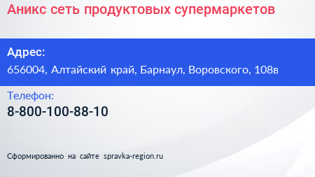 Аникс, сеть продуктовых супермаркетов по адресу 656004, Алтайский край, Барнаул, Воровского, 108в в дальнейшем Организация, размещена в следующих категориях:
