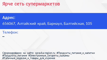 Ярче!, сеть супермаркетов по адресу 656067, Алтайский край, Барнаул, Балтийская, 105 в дальнейшем Организация, размещена в следующих категориях: