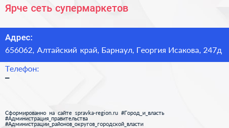 Ярче!, сеть супермаркетов по адресу 656062, Алтайский край, Барнаул, Георгия Исакова, 247д в дальнейшем Организация, размещена в следующих категориях: