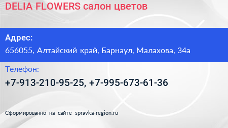 DELIA FLOWERS, салон цветов по адресу 656055, Алтайский край, Барнаул, Малахова, 34а в дальнейшем Организация, размещена в следующих категориях: