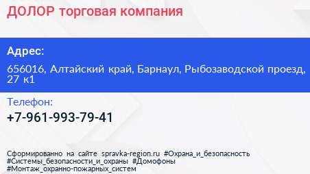 ДОЛОР, торговая компания по адресу 656016, Алтайский край, Барнаул, Рыбозаводской проезд, 27 к1 в дальнейшем Организация, размещена в следующих категориях: