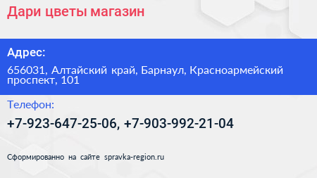 Дари цветы, магазин по адресу 656031, Алтайский край, Барнаул, Красноармейский проспект, 101 в дальнейшем Организация, размещена в следующих категориях: