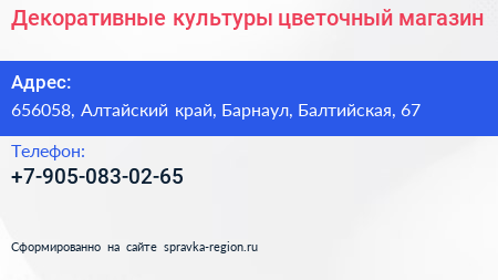 Декоративные культуры, цветочный магазин по адресу 656058, Алтайский край, Барнаул, Балтийская, 67 в дальнейшем Организация, размещена в следующих категориях: