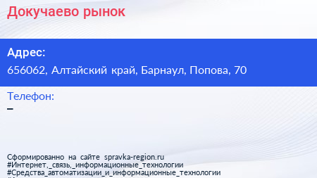 Докучаево, рынок по адресу 656062, Алтайский край, Барнаул, Попова, 70 в дальнейшем Организация, размещена в следующих категориях:
