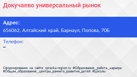 Докучаево, универсальный рынок по адресу 656062, Алтайский край, Барнаул, Попова, 70Б в дальнейшем Организация, размещена в следующих категориях: