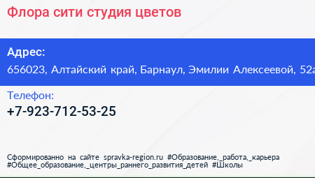 Флора-сити, студия цветов по адресу 656023, Алтайский край, Барнаул, Эмилии Алексеевой, 52а в дальнейшем Организация, размещена в следующих категориях: