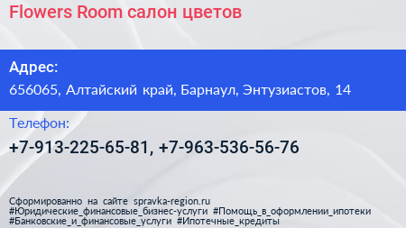 Flowers Room, салон цветов по адресу 656065, Алтайский край, Барнаул, Энтузиастов, 14 в дальнейшем Организация, размещена в следующих категориях: