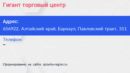 Гигант, торговый центр по адресу 656922, Алтайский край, Барнаул, Павловский тракт, 311 в дальнейшем Организация, размещена в следующих категориях:
