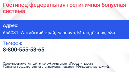 Гостинец, федеральная гостиничная бонусная система по адресу 656031, Алтайский край, Барнаул, Молодёжная, 68а в дальнейшем Организация, размещена в следующих категориях: