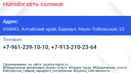 Humidor, сеть салонов по адресу 656043, Алтайский край, Барнаул, Мало-Тобольская, 23 в дальнейшем Организация, размещена в следующих категориях: