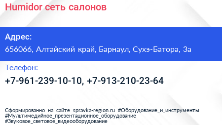 Humidor, сеть салонов по адресу 656066, Алтайский край, Барнаул, Сухэ-Батора, 3а в дальнейшем Организация, размещена в следующих категориях: