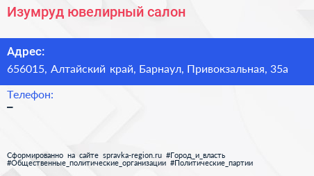 Изумруд, ювелирный салон по адресу 656015, Алтайский край, Барнаул, Привокзальная, 35а в дальнейшем Организация, размещена в следующих категориях:
