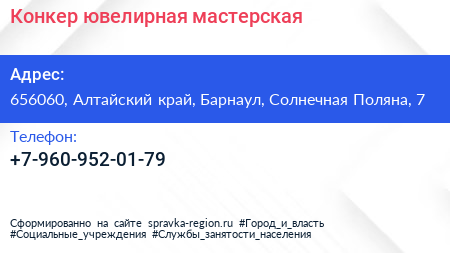 Конкер, ювелирная мастерская по адресу 656060, Алтайский край, Барнаул, Солнечная Поляна, 7 в дальнейшем Организация, размещена в следующих категориях: