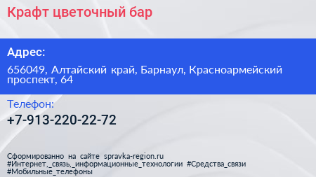 Крафт, цветочный бар по адресу 656049, Алтайский край, Барнаул, Красноармейский проспект, 64 в дальнейшем Организация, размещена в следующих категориях: