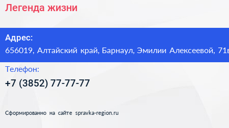 Легенда жизни по адресу 656019, Алтайский край, Барнаул, Эмилии Алексеевой, 71в в дальнейшем Организация, размещена в следующих категориях: