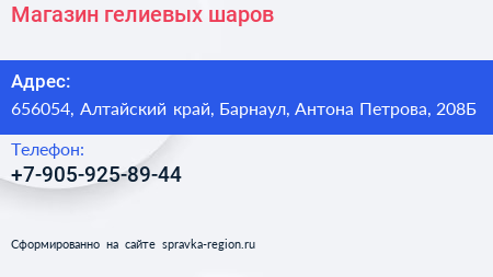 Магазин гелиевых шаров по адресу 656054, Алтайский край, Барнаул, Антона Петрова, 208Б в дальнейшем Организация, размещена в следующих категориях: