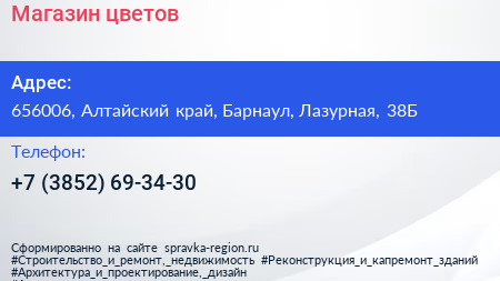 Магазин цветов по адресу 656006, Алтайский край, Барнаул, Лазурная, 38Б в дальнейшем Организация, размещена в следующих категориях: