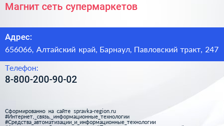 Магнит, сеть супермаркетов по адресу 656066, Алтайский край, Барнаул, Павловский тракт, 247 в дальнейшем Организация, размещена в следующих категориях:
