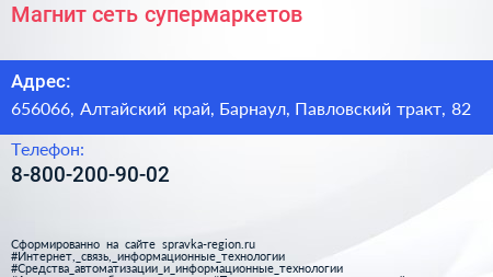 Магнит, сеть супермаркетов по адресу 656066, Алтайский край, Барнаул, Павловский тракт, 82 в дальнейшем Организация, размещена в следующих категориях: