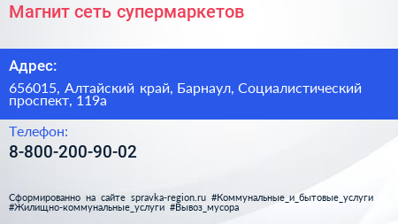 Магнит, сеть супермаркетов по адресу 656015, Алтайский край, Барнаул, Социалистический проспект, 119а в дальнейшем Организация, размещена в следующих категориях: